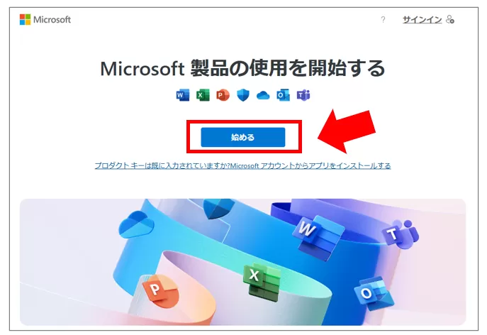 https://setup.office.com へアクセスし「始める」を選択します。