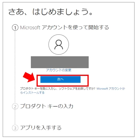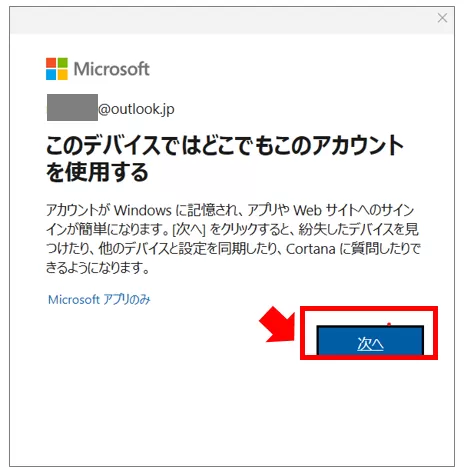 アカウントの確認画面が表示されたら「次へ」を選択します。