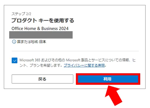 Officeの製品名を確認して【利用】を選択します。