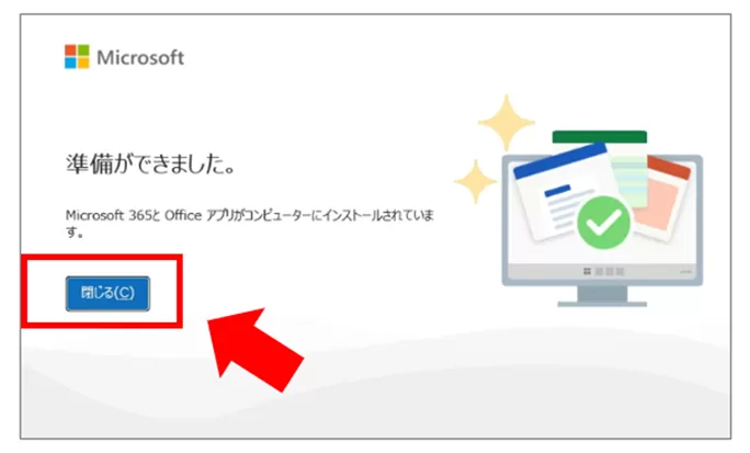 「準備ができました。」と表示されたら「閉じる」を選択します。