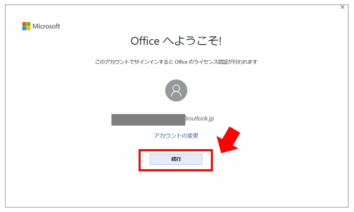 ExcelやWordなどを起動し「Officeへようこそ!」画面が表示された場合は、マイクロソフトアカウントを確認し【続行】を選択します。