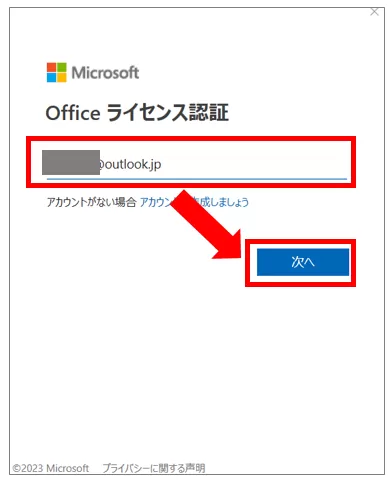 「Officeライセンス認証」の画面が表示されたら、ダウンロード時にサインインしたMicrosoftアカウントでログインします。