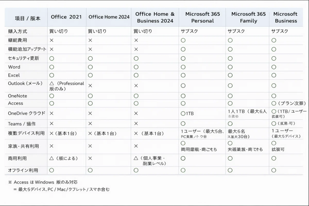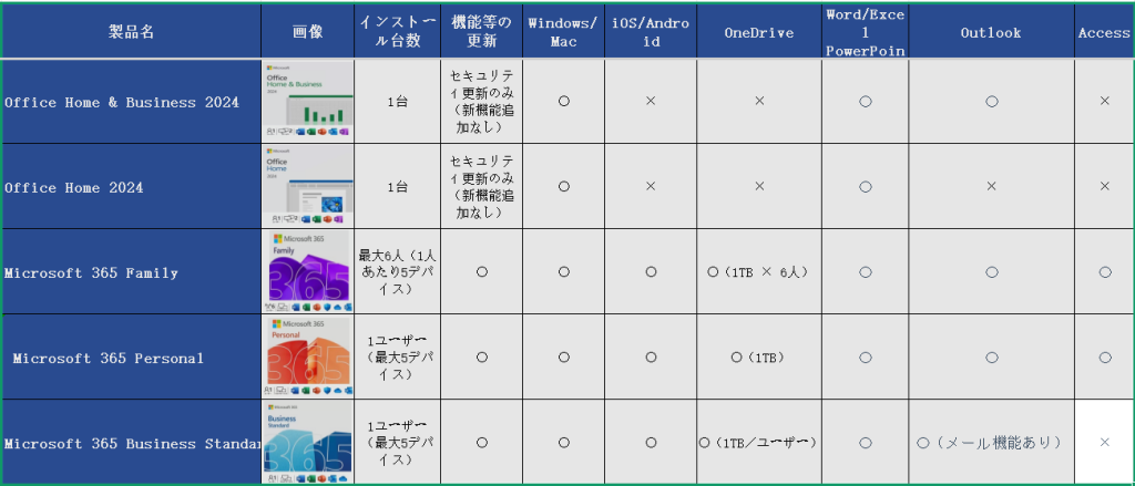 これまでにご紹介したとおり、Office には多くのバージョンや機能があり、一見すると選択が難しく感じられます。しかし、各製品の特徴を比較表で整理してみると、用途に合った選択肢は自然と絞られます。